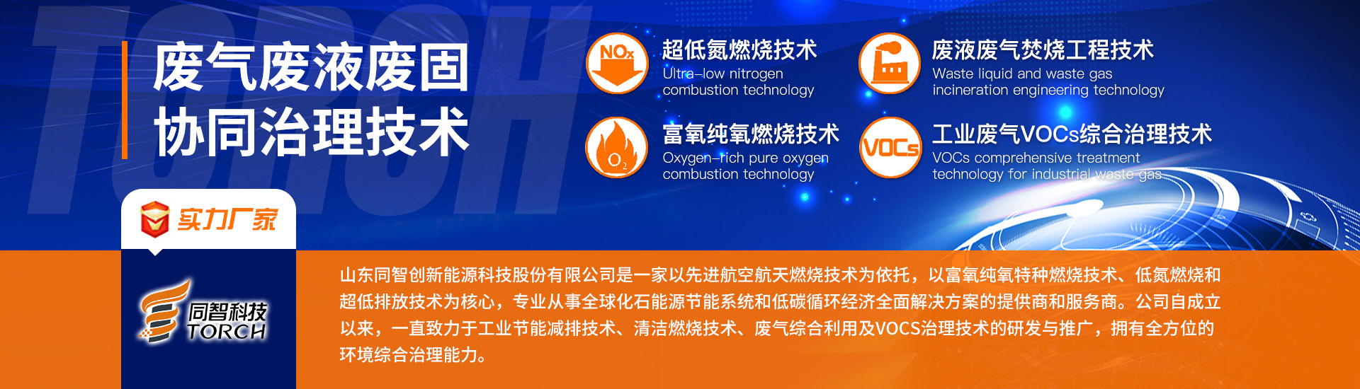山東同智創新能源科技股份有限公司是一家以先進航空航天燃燒技術為依托,以富氧純氧特種燃燒、低氮燃燒和超低排放技術為核心,專業從事全球化石能源節(jié)能系統和低碳循環(huán)經濟全面解決方案的提供商和服務商。公司自成立以來,一直致力于工業節(jié)能減排技術、清潔燃燒技術、廢氣綜合利用及VOCs治理技術的研發(fā)與推廣,擁有國內一流的環(huán)境綜合治理能力,是節(jié)能環(huán)保行業的領導者。